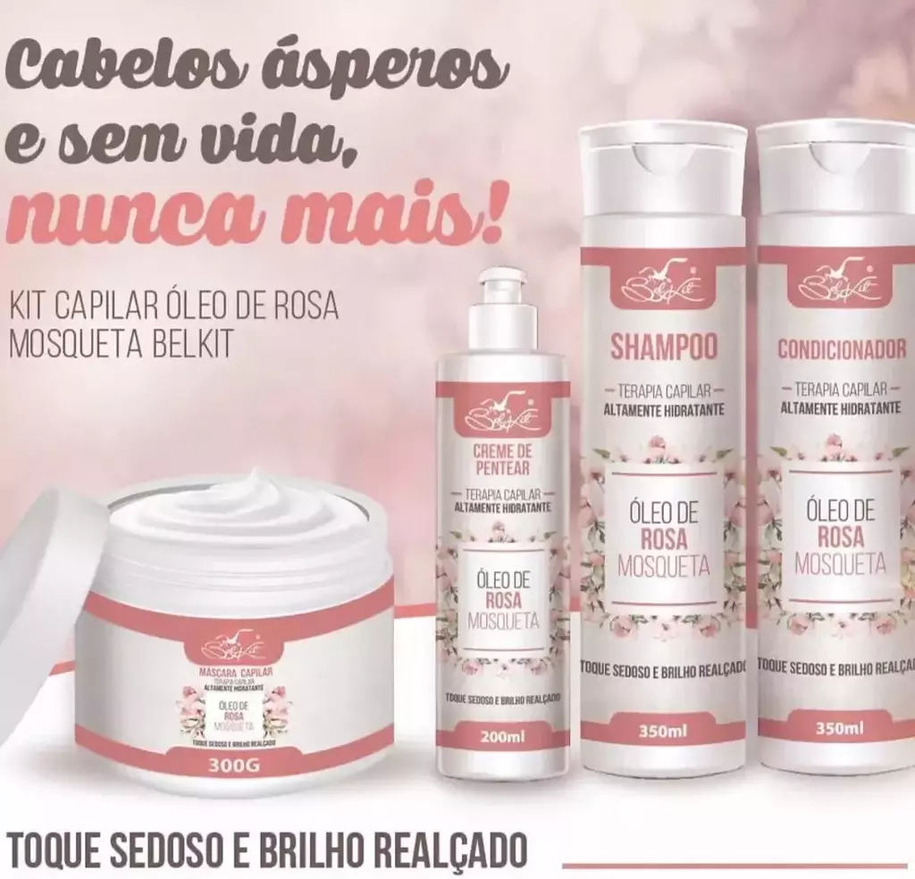 Pensando sempre na qualidade em primeiro lugar, a linha Óleo de Rosa Mosqueta da Belkit promove uma hidratação profunda nos cabelos, trazendo mais brilho, força e maciez. O kit traz a linha completo com shampoo, condicionador, máscara hidratante e creme para pentear. Ideal para mulheres que gostam de exibir um cabelo forte, saudável e sedoso.